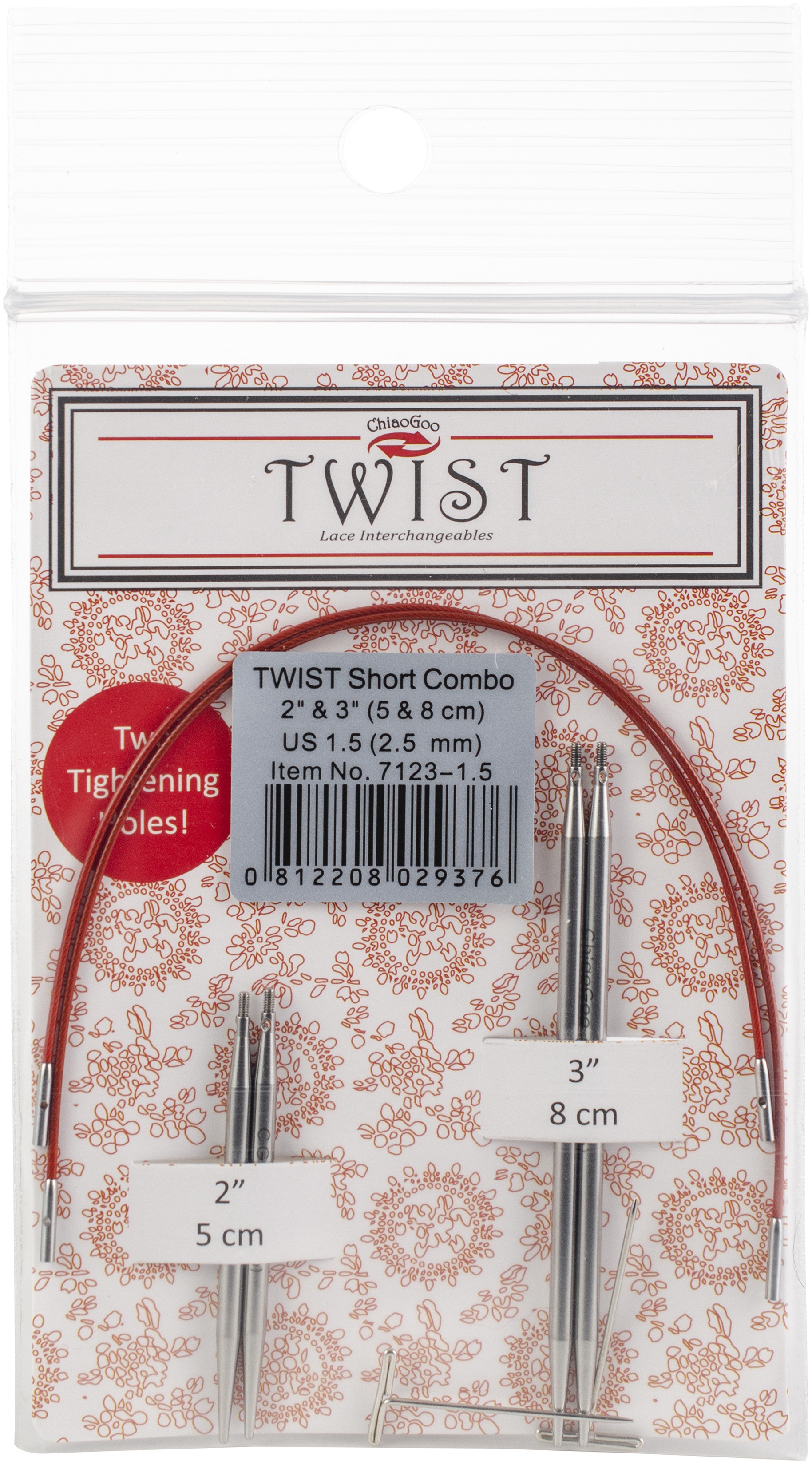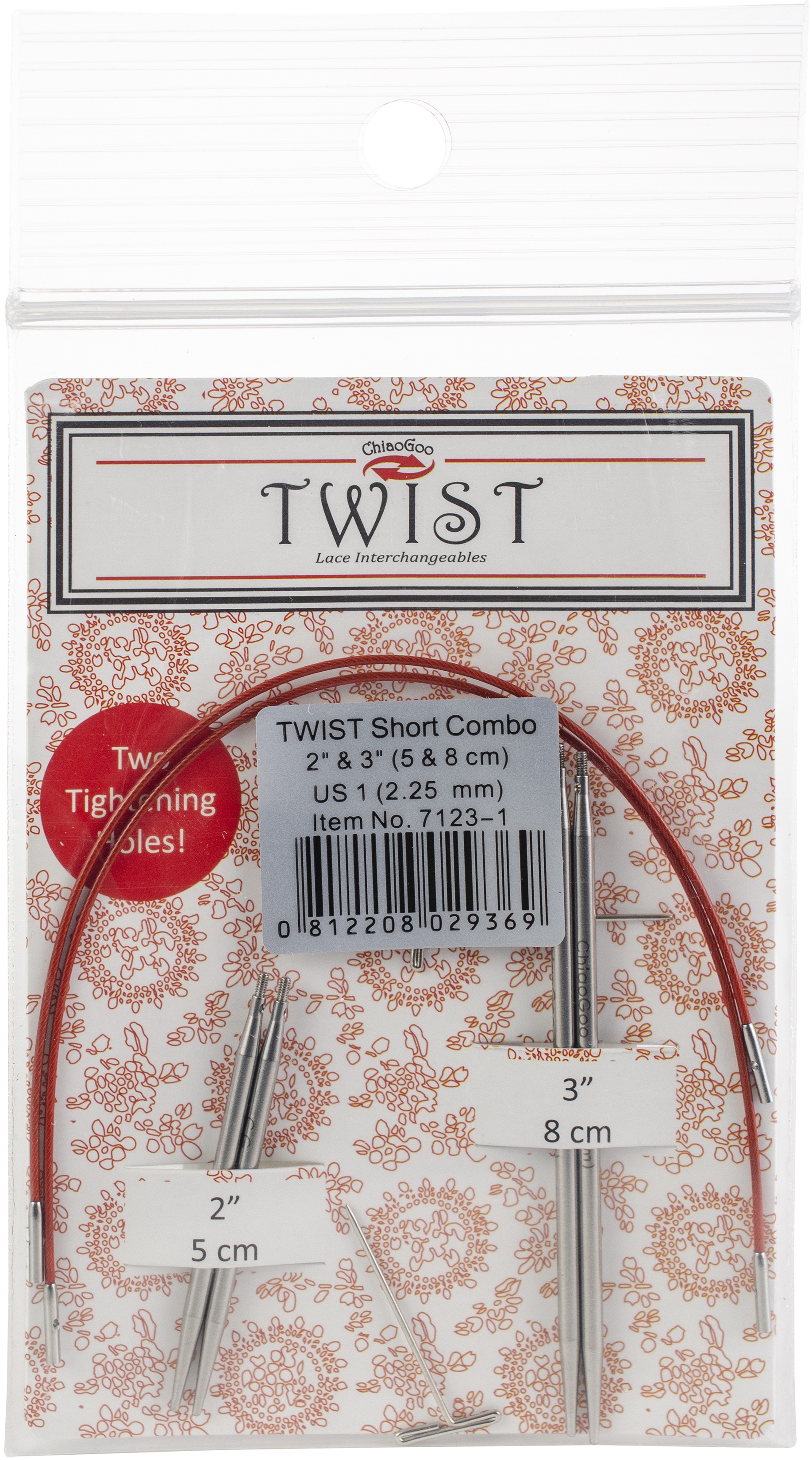 Combo packs contain one 2 (5cm) and one 3 (8cm) set of the same size tip as well as two cables allowing knitters to make 9 (23cm) - 12 (31cm) circulars are solid, have a MINI diameter join and tightening hole.