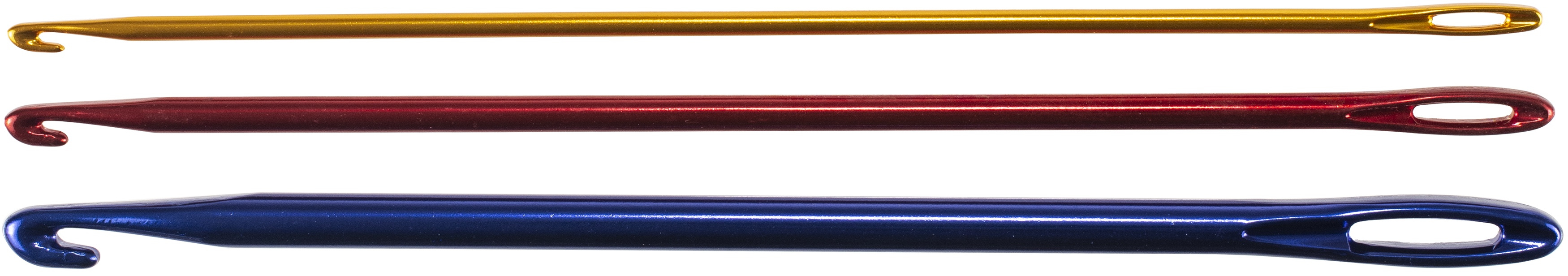 A set of 6.5 inch long aluminum needles with a crochet hook on one end and an eye on the other. Used for Locker Rug making on canvas, Leno weaving, and Knooking knitting. This package contains three 6.5 inch ling aluminum needles. Sizes: 2.8mm, 4mm and 6mm