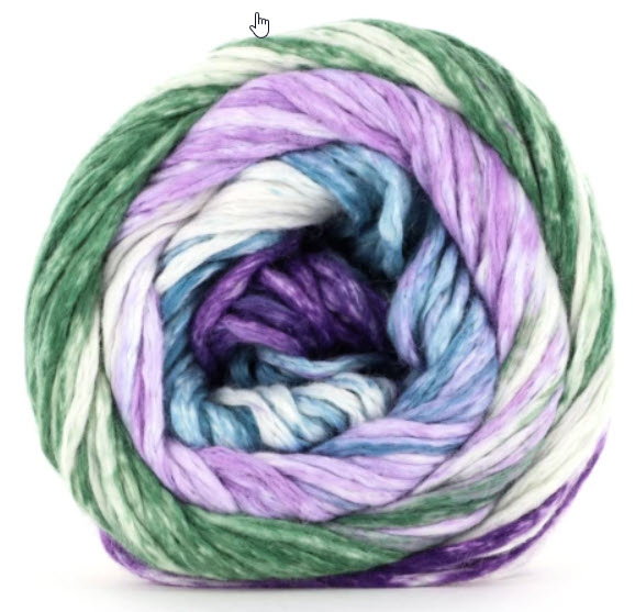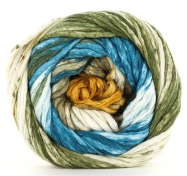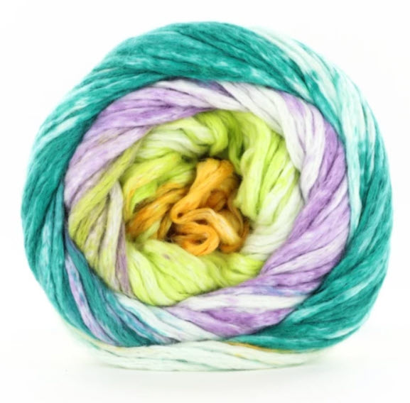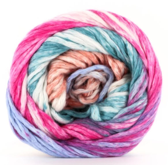 Super soft Israeli Mako cotton and a bit of nylon for added strength, Nimbus Stripes is a new unique self striping print using the bulky Nimbus as a base! Each knits up at a chunky gauge of 12-15 stitches per 4 inches on US 9-11 (5.5-8.0mm) needles. Imagine the joy of warm weather cotton knitting combined with a bulky gauge. Fairly unique, wouldn't you agree?