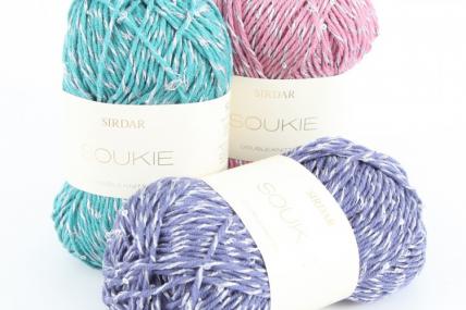 Spattered with sequins, Soukie DK is a sophisticated yarn with cotton and shine twisted together in fabulous colours for women and girls. It creates glamorous hand knits for all those glittering parties and holiday evenings that catch the light and make you sparkle!