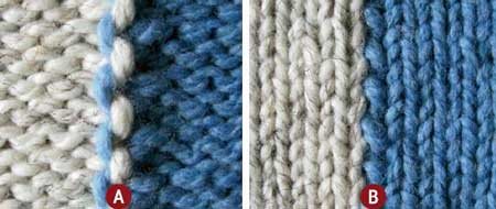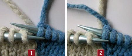 1: צבע כחול הינו הצבע הישן, צבע לבן הינו הצבע החדש. 2: מניחים את הצבע הישן מעל החדש ואוספים את הצבע החדש לסריגה. בצורה זו הצבע הישן נתפס ולא נוצר חור.
