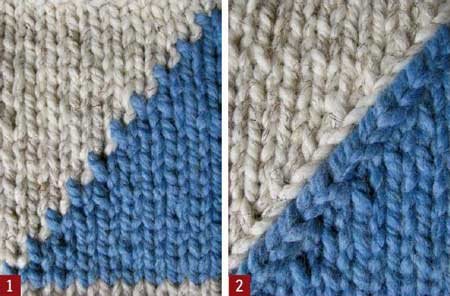 צורת מדרגות כזו אולי תהיה מקובלת בעיצובים קטנים אבל כאשר הדוגמא כוללת אלכסונים צבעוניים גדולים או קוים מעוקלים אזי מודגשים קווי החיבור בין האלמנטים ולא האלמנטים עצמם. כאשר סורגים עיצוב שכזה בחוט עבה יותר אזי התוצאה תכים גדולים יותר והדגשה רבה יוצר של קווי החיבור בין הצבעים. צורת סריגה זו מעדנת את קווי החיבור ויוצרת קוים מעודנים יותר.